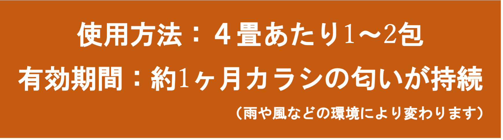 注意事項:●本品には強い刺激臭があるので、袋開口部や本品を直接臭うことはしないでください。●害虫を寄せ付けず、追い払うための忌避です。●100%忌避するわけではありません。●白い袋(不織布)は破かずにそのままご使用ください。 ●忌避効果は約1か月が目安です。(設置場所の環境により変動します)●使用しない製品は密閉チャック袋に入れ、直射日光・火気を避けて保管してください。●本品は食べ物ではありません。人・ペットの口に入らないようにしてください。●子どもの手の届く場所に置かないでください。●誤って口や目に入った場合は多量の水で洗い流いし直ちに医師に相談してください。●手などに香料が付着した場合は石鹸水で洗ってください。●家具・電化製品及びコンセントの上には置かないでください。●ゴミに出される場合は各市町村の指定区分に従ってください。ご使用の際は必ず裏面の説明書きをお読みの上、ご使用下さい。