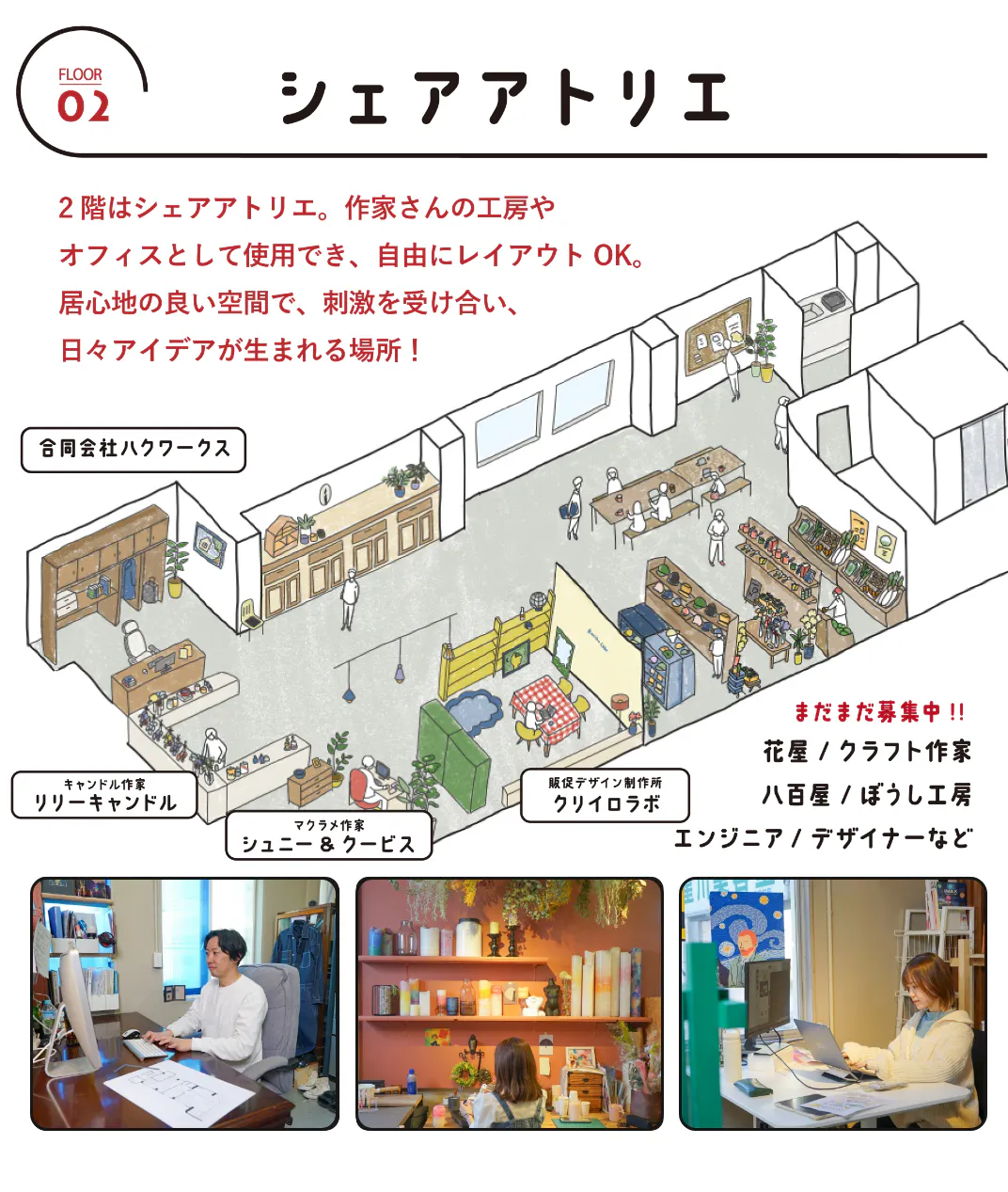 周辺の事業用物件は家賃がやや高めで、新しく店舗や事務所をかまえたいと思ってもハードルが高いのが現状です。そんな中で手軽に借りてシェアできる工房やレンタルオフィス、イベントスペースのある白熊ビルヂングは、若手の挑戦を後押しできる居場所になれると考えています。