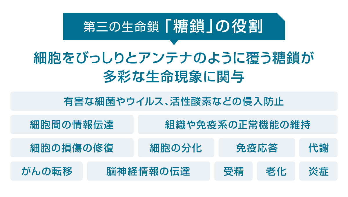 人の体は数十兆個の細胞から成り、第一の生命鎖(DNA)第二の生命鎖(タンパク質)と並び、第三の生命鎖である「糖鎖」に関心が集まっています。最近の研究で糖鎖の多様な機能が明らかになってきました。