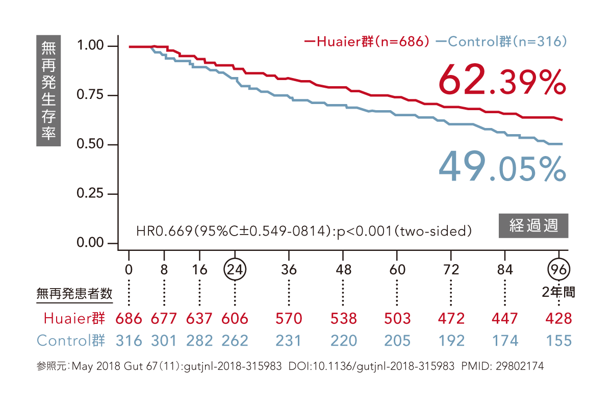 2018年、著名な英国の医学雑誌Gutにフアイアの抗がん作用に関する臨床研究が掲載されました。「臨床で1,000例規模に及ぶ肝臓がん手術後の患者に対しHuaierを投与し観察した結果、96週間後にHuaierを服用した群は、しなかった群にくらべて無再発生存率で明らかな有意差があった」という驚くべきものでした。