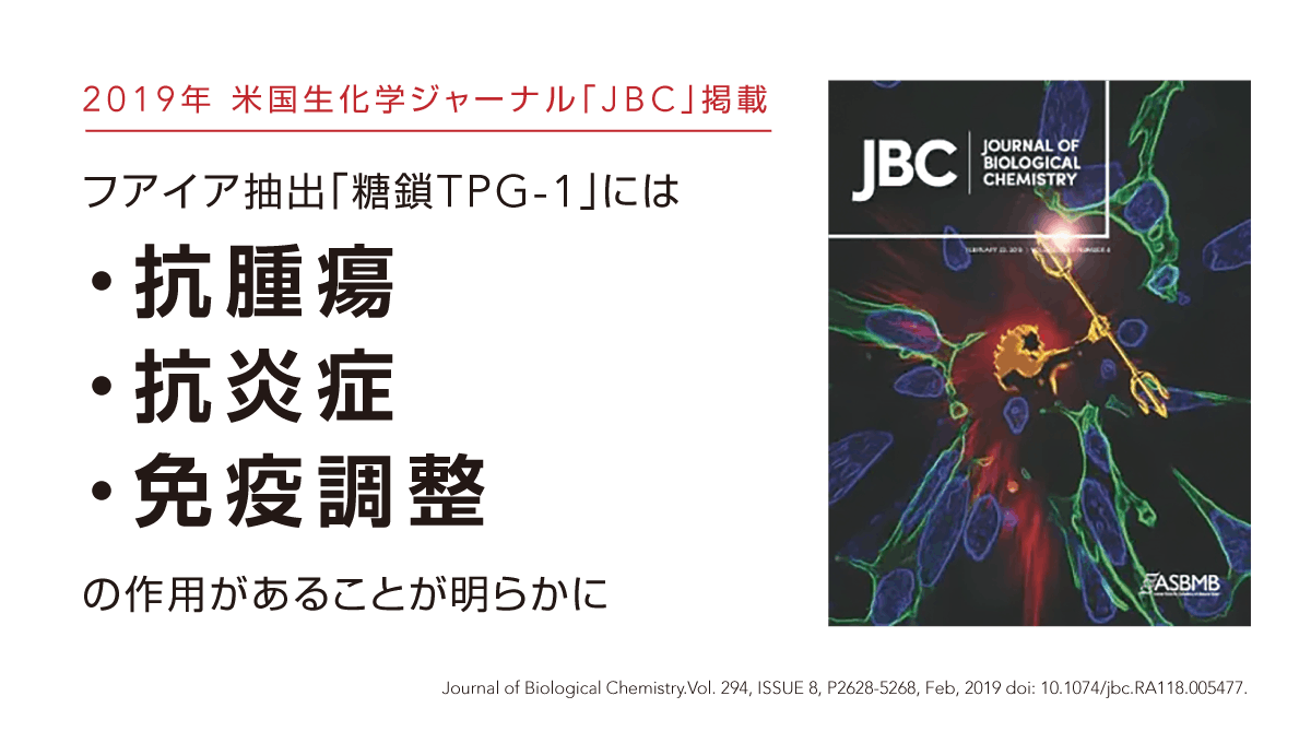 それが、生薬フアイアに含まれる「糖鎖TPG-1」という成分です。2019年に超一流の米国生化学ジャーナルJBCに掲載された研究論文によればフアイア菌糸体抽出物から糖鎖の一種「TPG-1」という新しい成分を発見し、その成分と驚くべき効果を解明したと報告されました。フアイア抽出糖鎖TPG-1には抗腫瘍、抗炎症、免疫調整の明らかな作用が認められたことが報告されました。