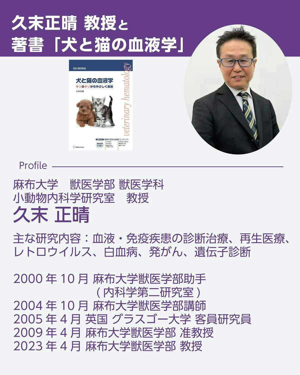 久末正晴先生は麻布大学獣医学部内科学研究室の教授であり、麻布大学附属動物病院内科に紹介されてくる様々な症例に日々取り組まれておられます。