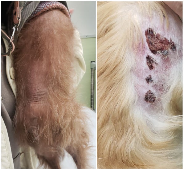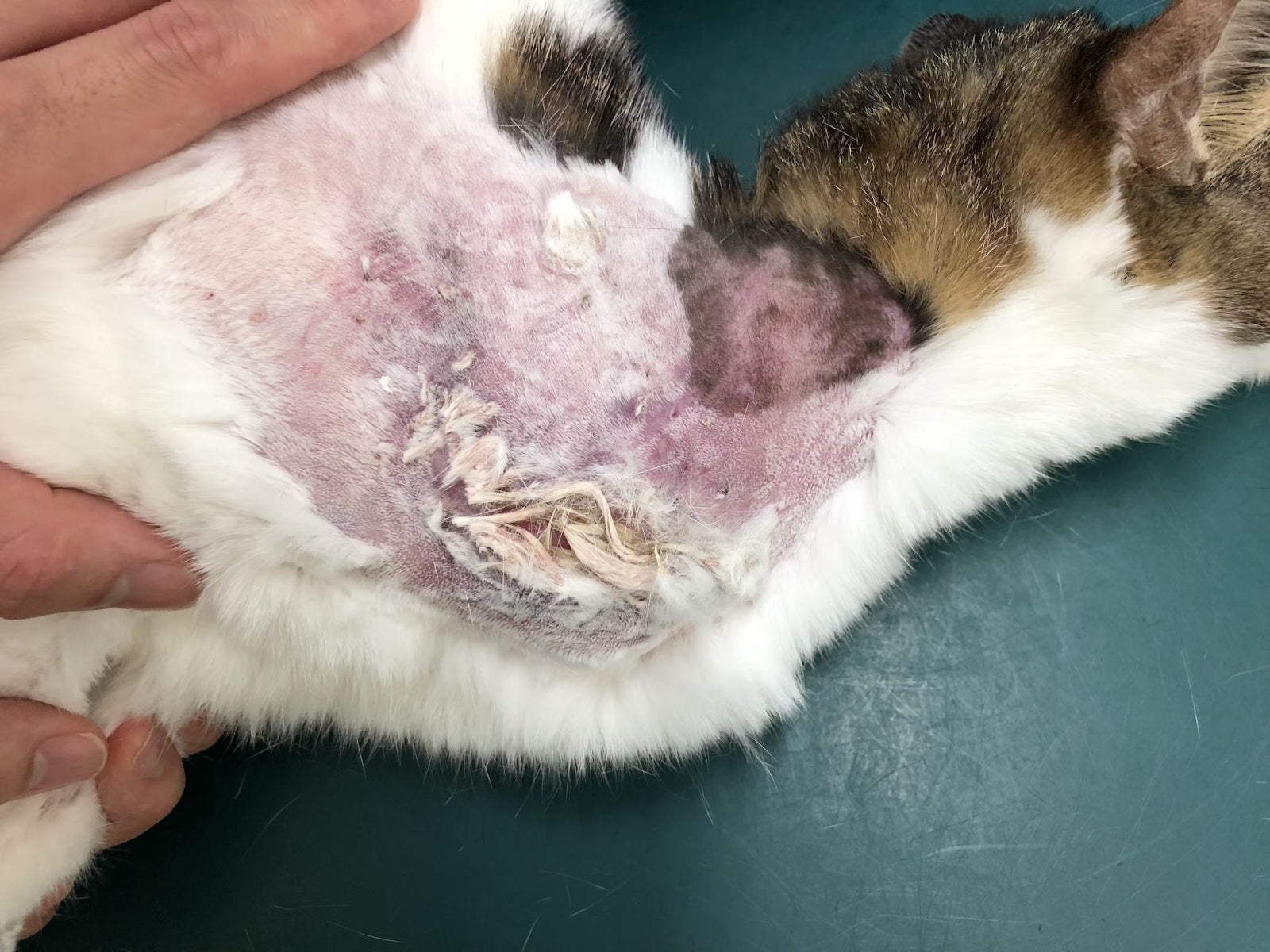 ▲ステロイドの副作用により皮膚の裂傷をおこしている猫