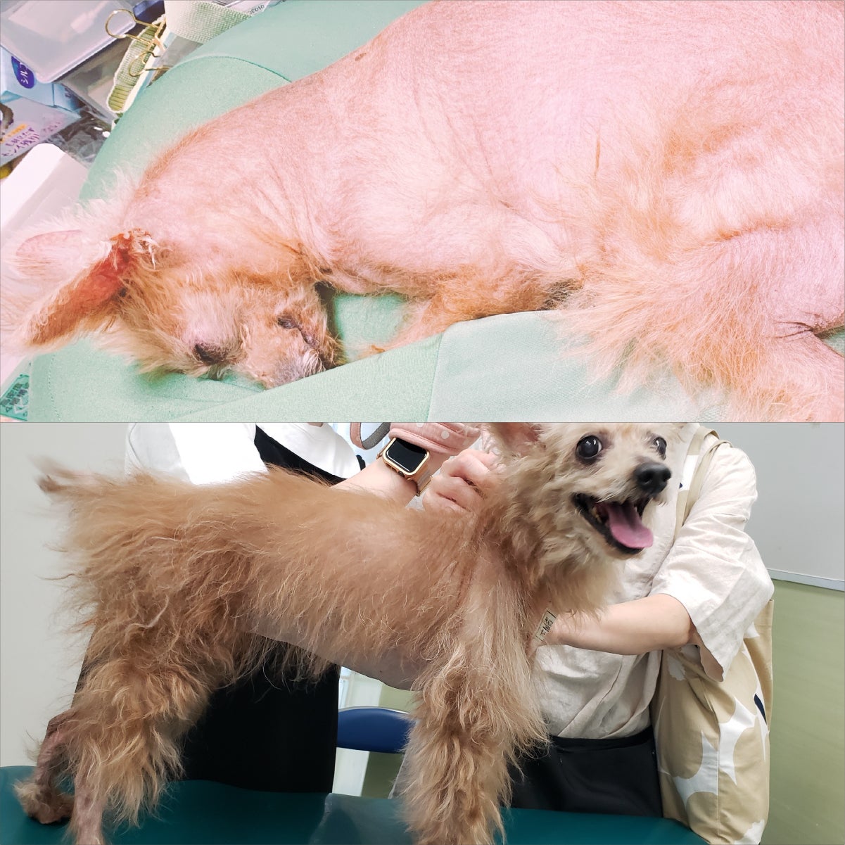 ▲ステロイドの副作用により脱毛と元気活力が衰えている犬
