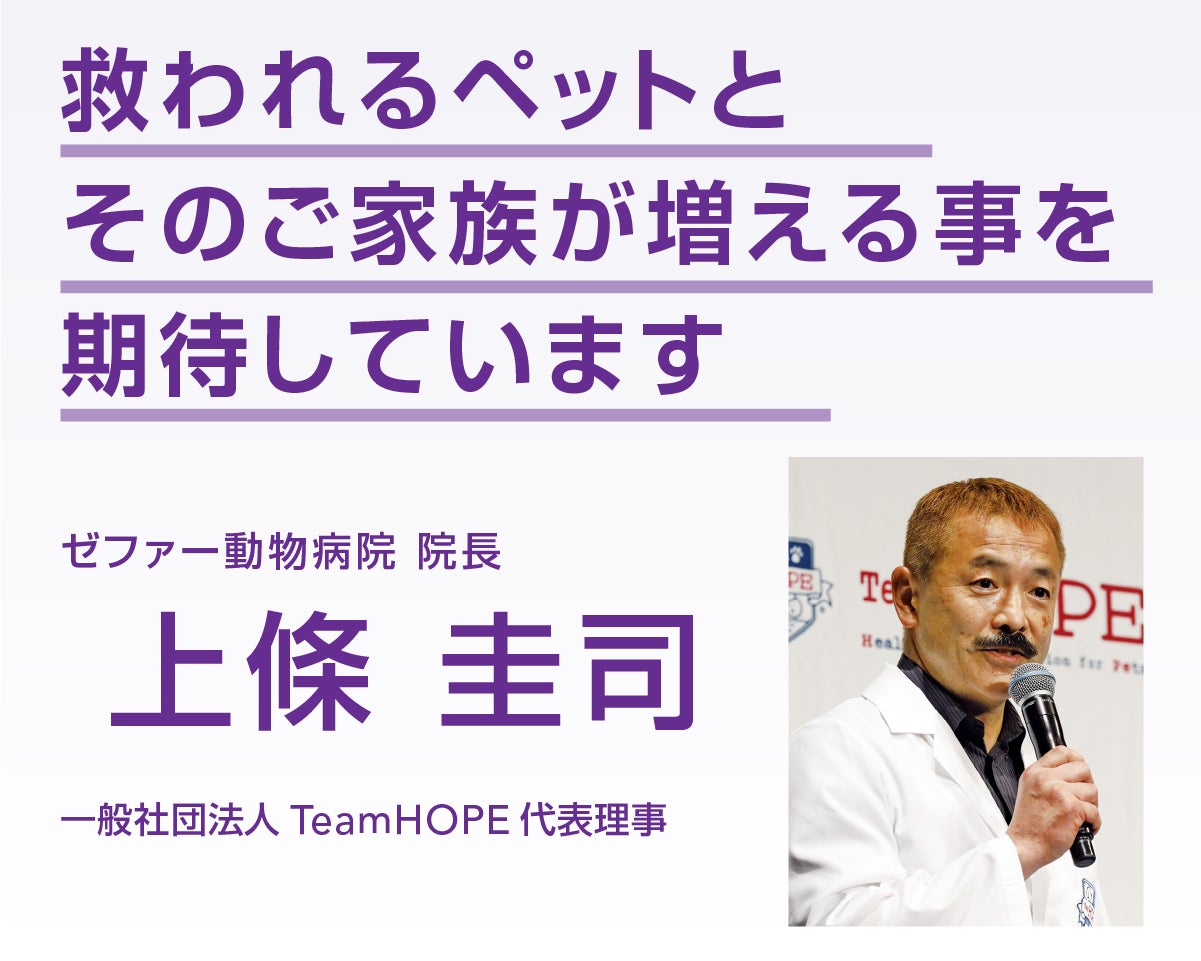 我々Team HOPEはペットの健康診断を推進し、ペットの健康寿命を伸ばし、ペットとご家族様の幸せな時間を少しでも長くしたいという共通理念を持った全国の獣医師がTeamとなって活動している団体です。