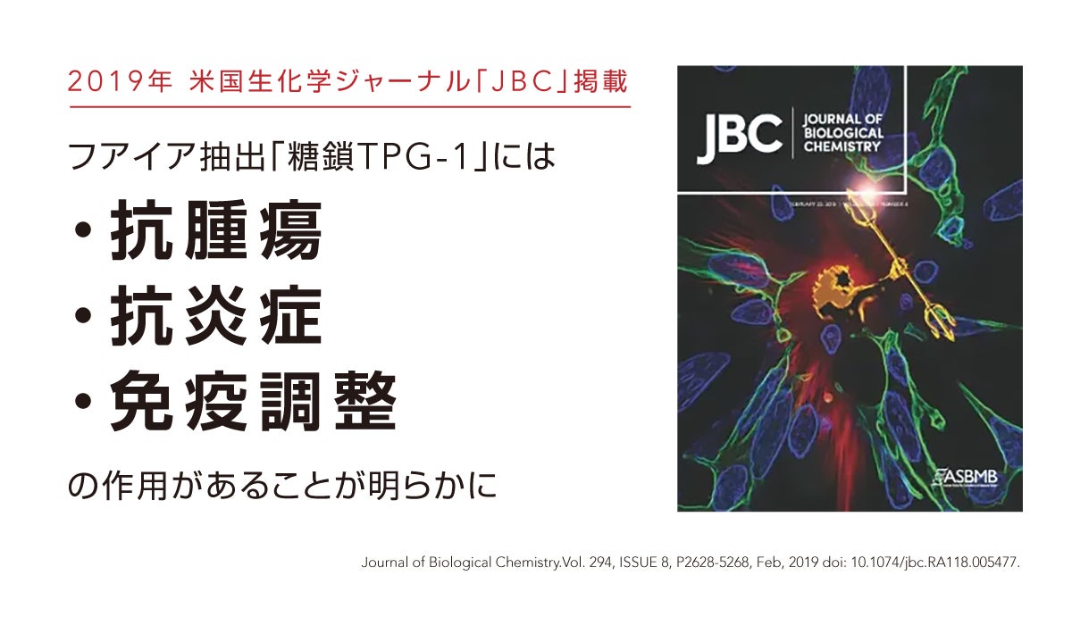 それが、生薬フアイアに含まれる「糖鎖TPG-1」という成分です。2019年に超一流の米国生化学ジャーナルJBCに掲載された研究論文によればフアイア菌糸体抽出物から糖鎖の一種「TPG-1」という新しい成分を発見し、その成分と驚くべき効果を解明したと報告されました。フアイア抽出糖鎖TPG-1には抗腫瘍、抗炎症、免疫調整の明らかな作用が認められたことが報告されました。