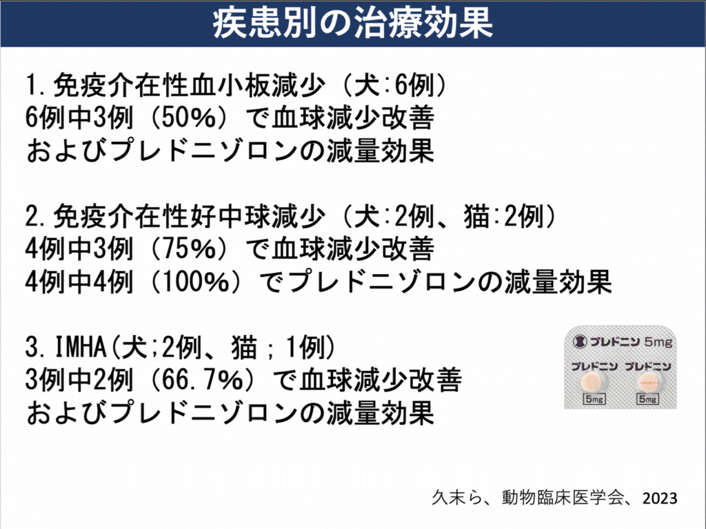 これまで大学病院でフアイア糖鎖TPG-1を使用することにより症状に改善が見られたり、ステロイドの使用量を減らすことが可能になった症例を見てきました。それらの症例のうち、骨髄異形成症候群の犬と猫の症例を2023年と2024年に学会で症例発表させていただきました。