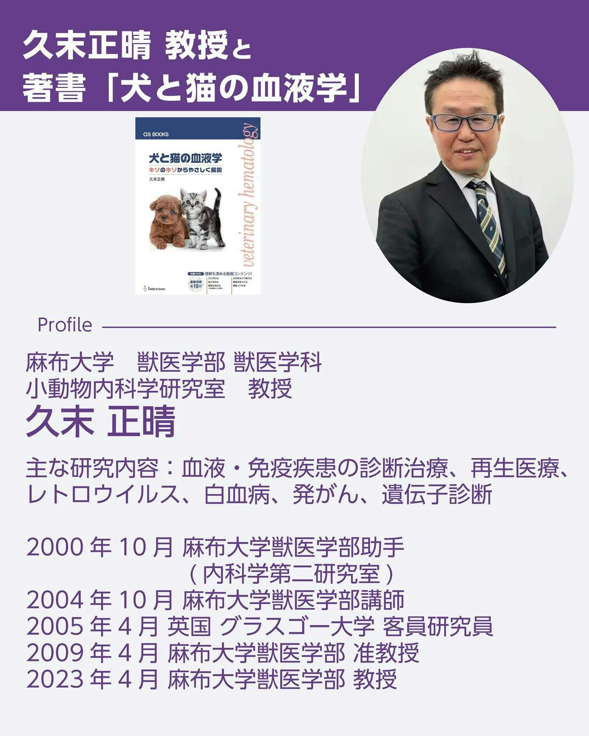久末正晴先生は麻布大学獣医学部内科学研究室の教授であり、麻布大学附属動物病院内科に紹介されてくる様々な症例に日々取り組まれておられます。