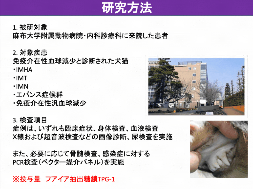 私達はその「効果」に着目し、日本獣医フアイア研究会から「フアイア糖鎖TPG-1」の情報をご提供いただき、2021年より犬猫用「フアイア」糖鎖TPG-1製剤を用いて、麻布大学の付属動物病院にて患者様に試してもらいました。小規模ながら治療の上手くいかない「免疫介在性溶血性貧血」「免疫介在性血小板減少および好中球減少」の「犬猫」について試験的な研究を行いました。