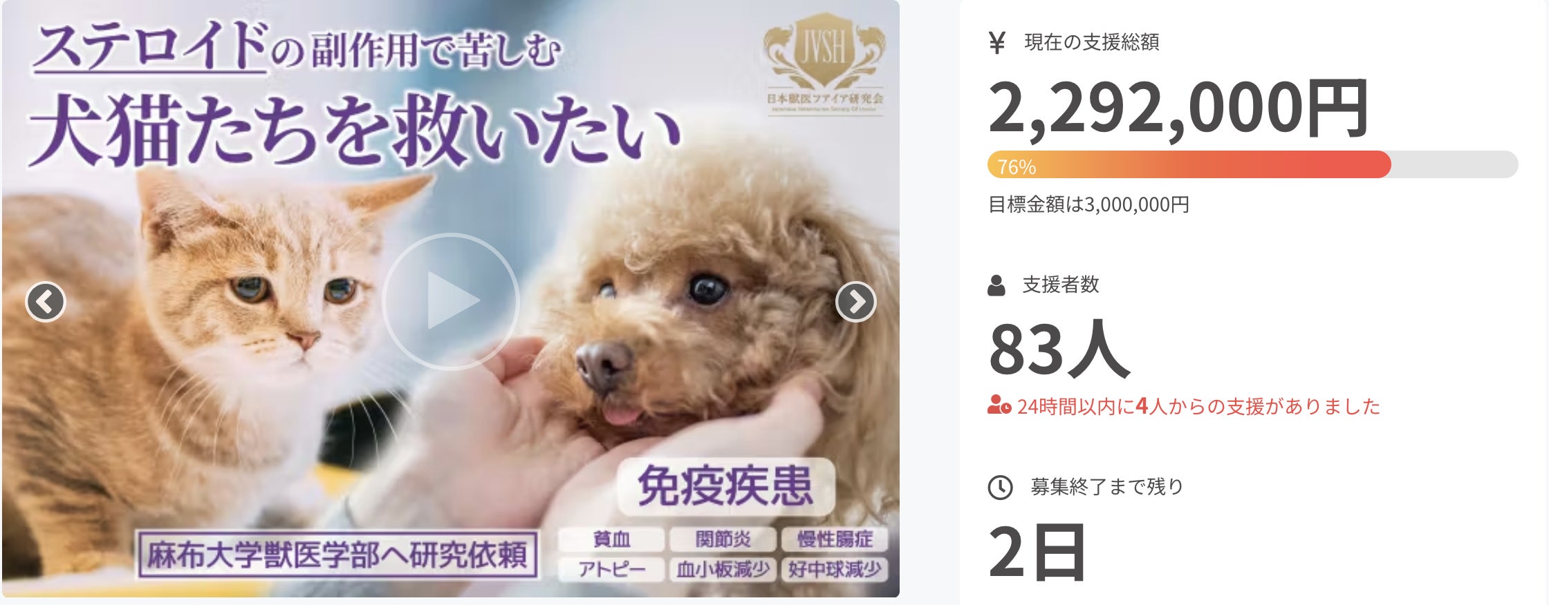 たくさんのご支援をいただき誠にありがとうございました。麻布大学様からもご報告がございましたが、本プロジェクトは無事達成いたしました。皆様から頂いたご支援と期待を胸に、麻布大学獣医学部へ研究依頼を行い、ステロイドの副作用で苦しむ犬猫を救う新たな治療法開発へ向けて取り組んでまいります。現在、お一人ずつお礼をお送りさせていただいており、ご報告、ご連絡が遅くなりましたことをお詫び申し上げます。研究の成果などについては、引き続き、こちらの活動報告からもお送りさせていただきますので、ぜひご覧いただけますと幸いに存じます。今回のプロジェクトは新たな治療法開発に向けたスタートです。ぜひこの研究活動にご注目をいただけますと幸いです。どうぞ、今後ともよろしくお願い申し上げます。日本獣医フアイア研究会 事務局〜お知らせ〜シルバースポンサー以上の支援をいただいた方へ下記の返礼につきまして、講義の収録が遅延している関係でご提供が1ヶ月程度遅れ、ご提供が8月中旬頃になる見込みでございます。完成後、改めてご連絡を差し上げます。お詫び申し上げます。ーーーーーーーーーーーーーーーーーーーーーーーーーーーーーーーーーーーーーーーーーー久末正晴教授の「血液学・免疫学セミナー」オンデマンド講義視聴権&オンライン質問会 ※2024年8月中旬から1年間視聴可能なオンデマンド講義動画を提供いたします ※オンライン質問会は、2024年9月頃開催を予定しています