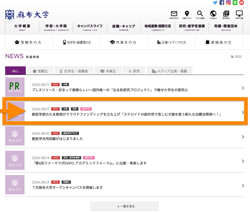本日、2024年6月17日付で麻布大学公式ホームページのニュースに