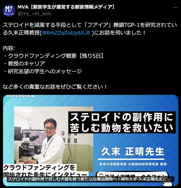 今回は「獣医師を志す全ての人」へ正しい情報を届けることを目標としたメディア「MVA」様から久末教授へ取材をいただきました。