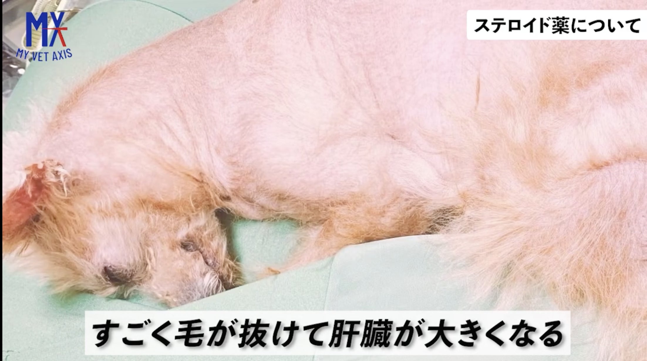 ↓今回の主眼となっている「ステロイド」の副作用について。免疫を下げる=炎症を抑える素晴らしい薬剤である一方、長期的に服用すると、脱毛や皮膚の裂傷、免疫を下げることによる感染症など、さまざまな副作用が出て、薬の副作用が原因で亡くなることもある。