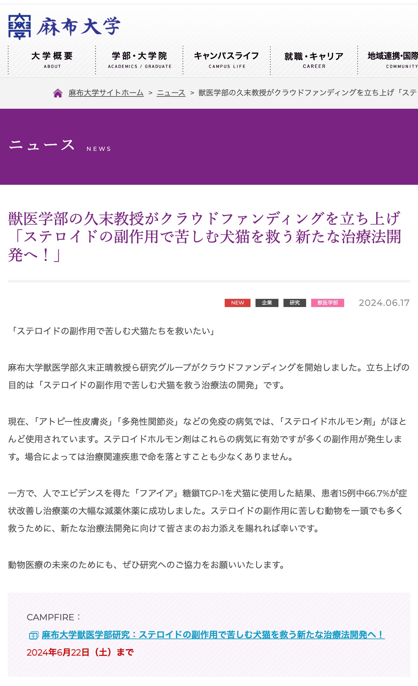 頂いた研究支援金は、麻布大学獣医学部 教授の久末正晴先生の研究グループに寄付、「ステロイドの副作用に苦しむ犬猫を救うための治療法開発」に充てられます。