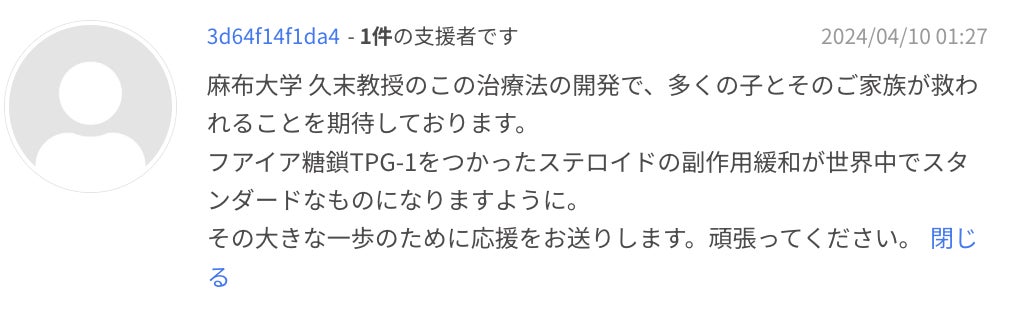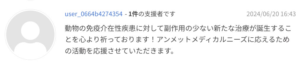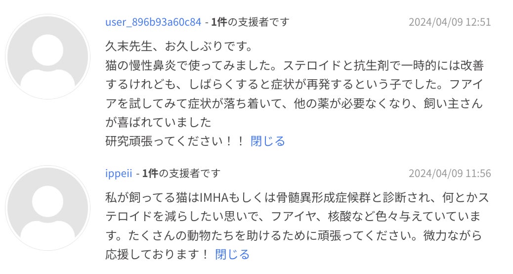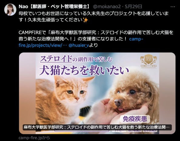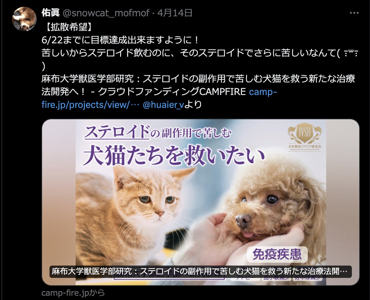 このプロジェクトは4月から麻布大学の研究支援金の募集を開始し、個人、獣医師、動物病院から集まった支援金は現時点で236万円。(締切6/22)