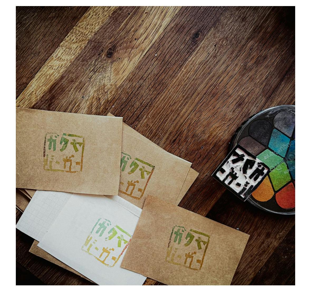 手づくりの消しゴムハンコを押した台紙は移転先の間取りやメモなんかを書いては不要になった紙の余白部分を四角く切っただけ。