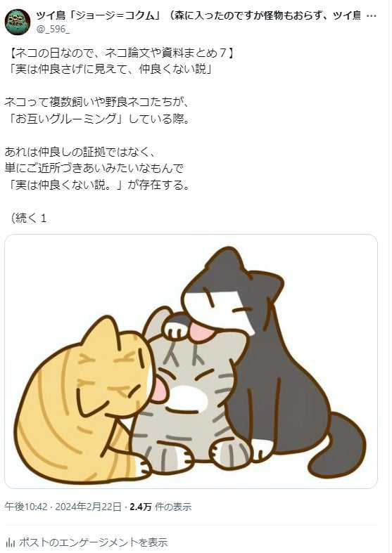 3,こちらはネコのグルーミングは仲良くない可能性説の論文