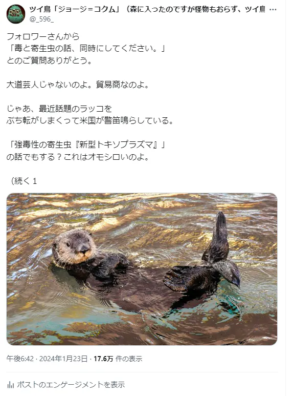 X(旧Twitter)にて貿易活動など輸入業務をつぶやく傍ら、毒性、寄生虫、危険生物や医学などの研究論文を解説しているアカウントです。