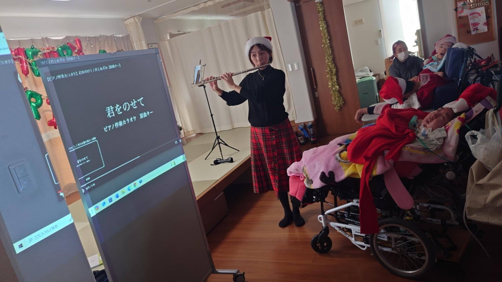 クリスマス曲の演奏のあとは、「君をのせて」と「上を向いて歩こう」をカラオケでみんなで楽しみました~