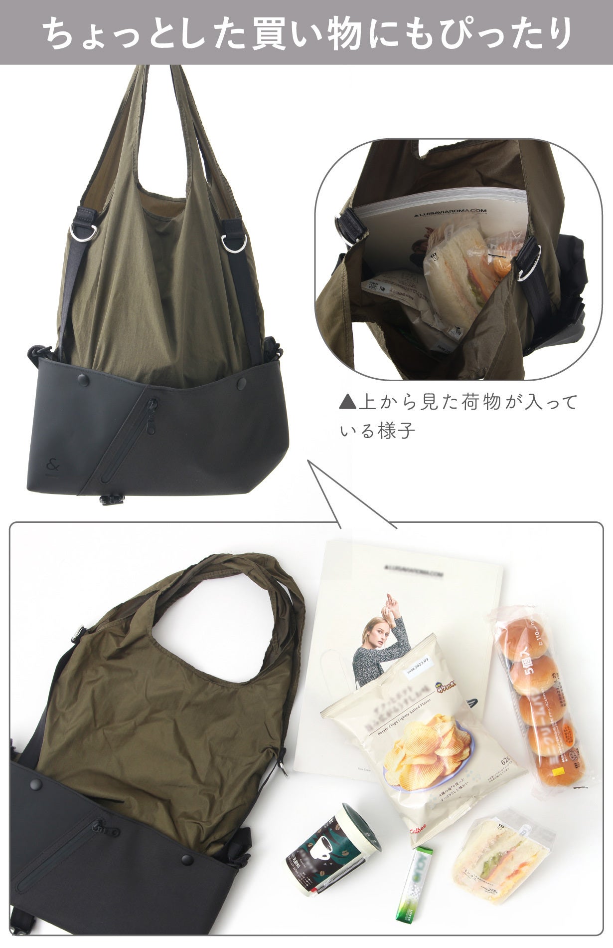 トートバッグ状態の時は、サコッシュバッグの間口がマチ代わりになり、荷物をより多く収納できます。