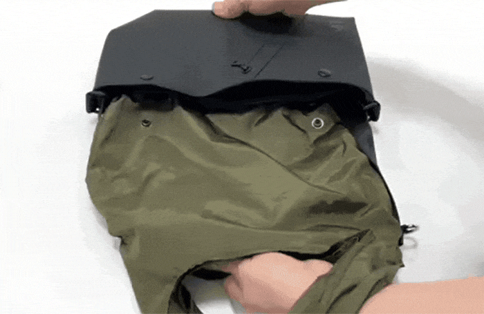 トートバッグを引き出したら、トートバッグの袋とバッグ本体に付いている4カ所のスナップボタンを接続することでバッグを一体化することができます。