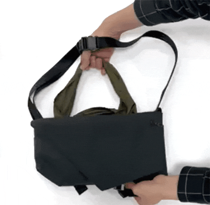 サコッシュバッグ時のストラップがトートバッグの袋部分と繋がっているので、ストラップを引っぱると、自動的にトートバッグの袋が収納されます。