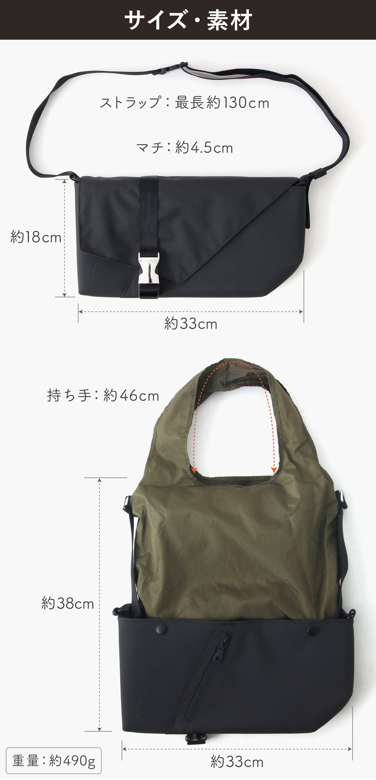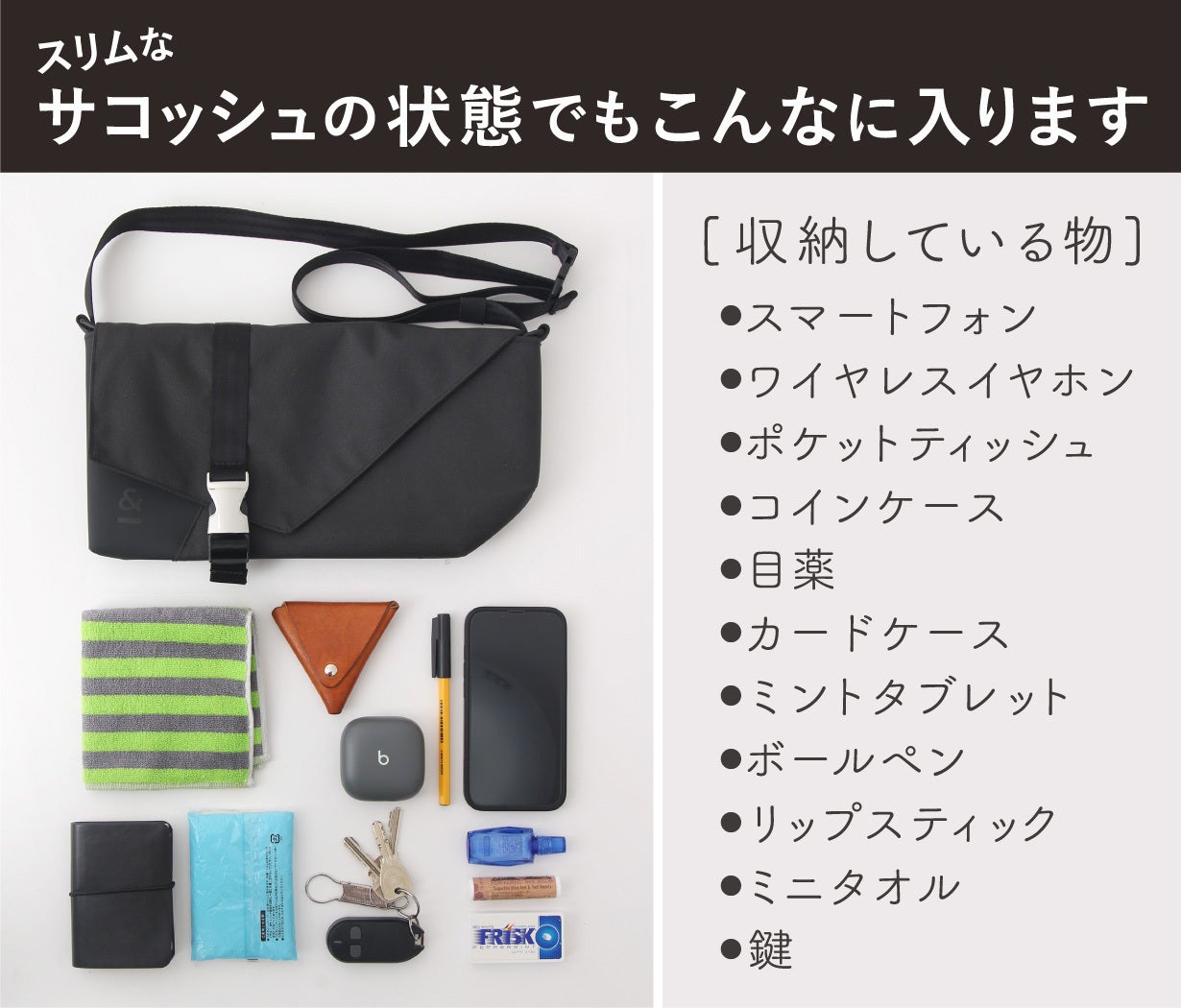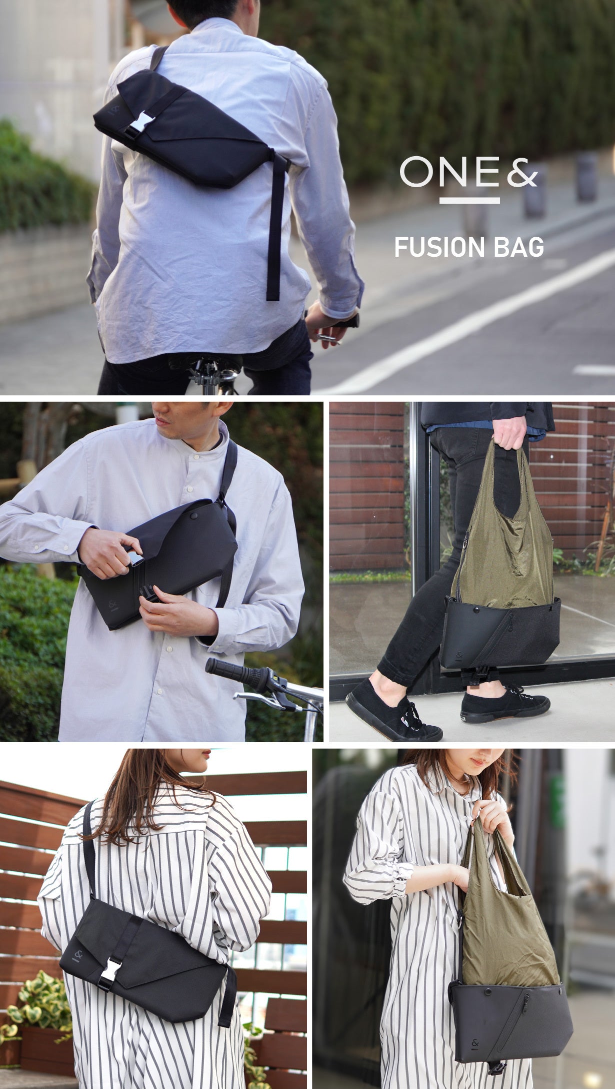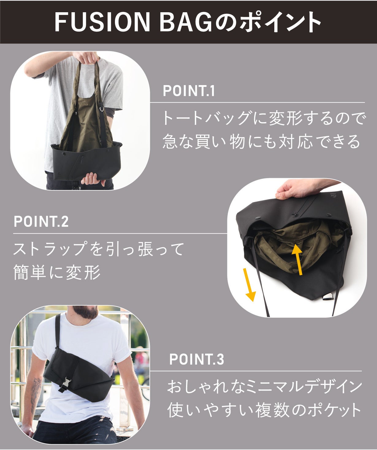 出かける時はできるだけ身軽に。『フュージョンバッグ』は、普段サコッシュバッグとして使いつつも、出先で荷物が増えた時にトートバッグとして使うことができる「サコッシュ」と「トート」2つのバッグを融合(フュージョン)した新しいバッグです。
