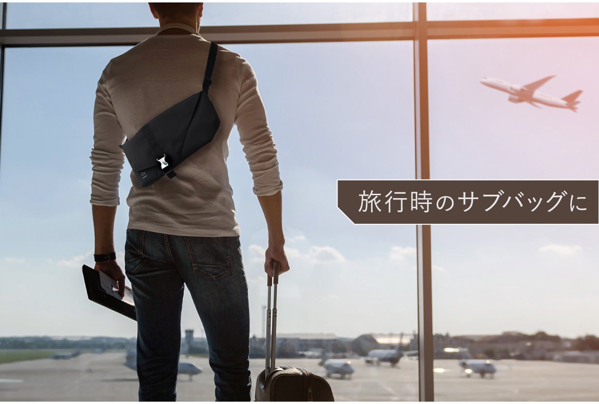 旅行先では身軽に行動できるサコッシュバッグで。お土産はトートバッグに入れることで余計な荷物が増えません。