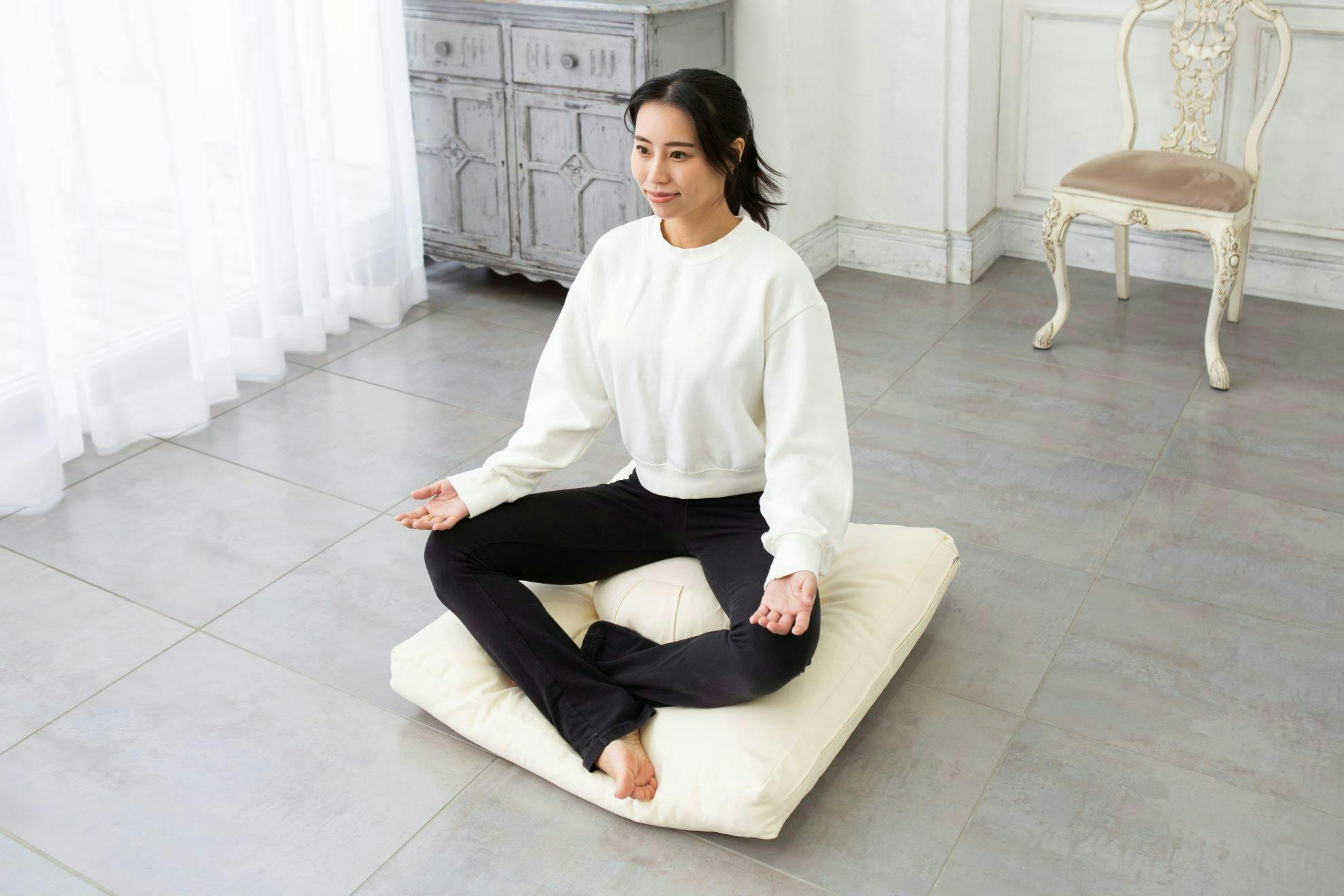 瞑想用クッションを使用し、お尻や骨盤を安定させましょう。