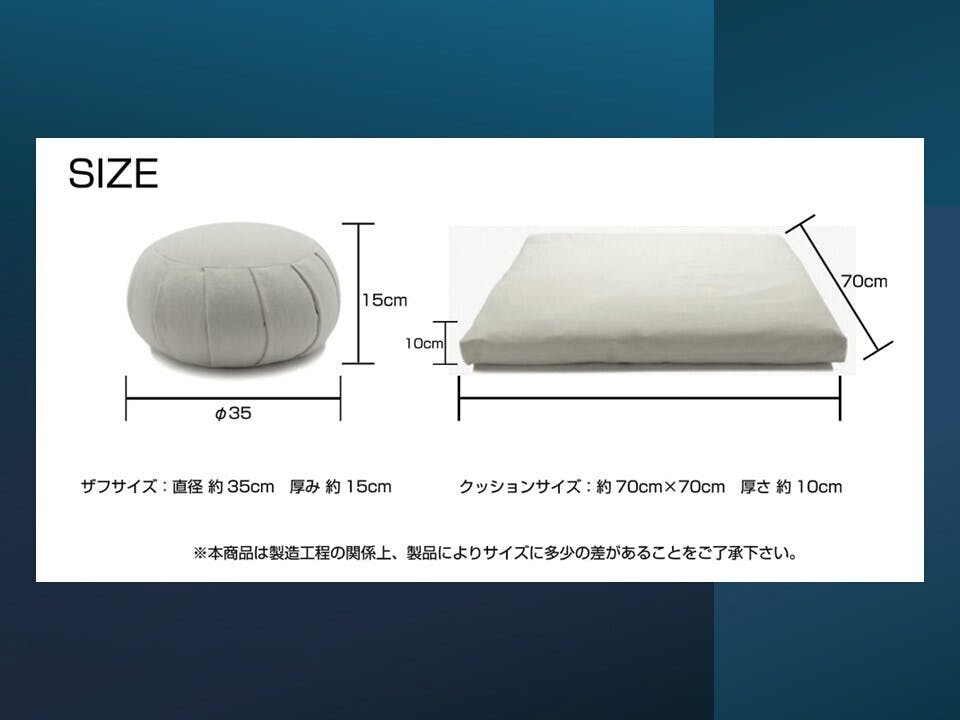約35㎝の丸型座布団と70㎝×70㎝の大判クッションはテレワークや食事などのご利用にも最適なサイズです。
