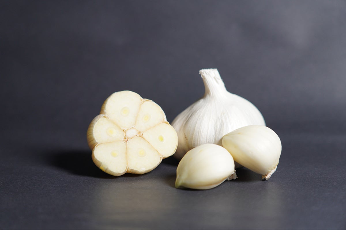 当店では、にんにく生産量日本一を誇る青森県南部で栽培される「福地ホワイト六片種」を使用しています。ミネラルや鉄分などの養分を多く含む肥沃な大地で育ち、大粒で糖度も高く青森県農業試験場の栽培試験ではその品質が認められ県を代表するにんにくとなりました。実が雪のように白く一粒一粒が大きく表面に張りがあり引き締まっているのが特徴。甘味があり、味も濃厚で栄養がぎっしり詰まった日本を代表する「最高級のブランドにんにく」です。