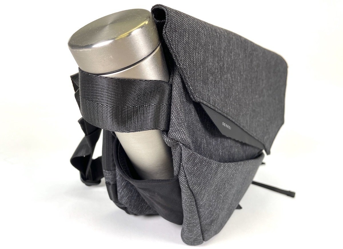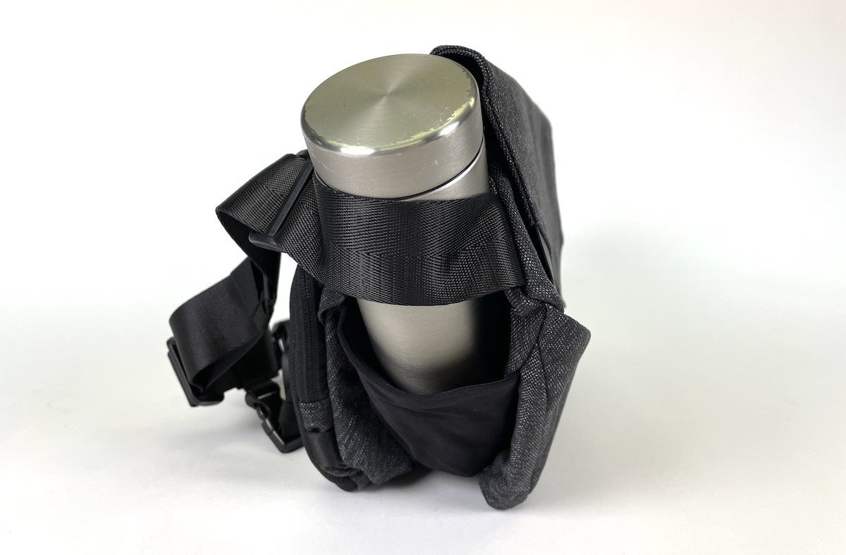 左右にあるサイドポケットはボトルホルダーになります。※サイドのポケットは左に比べて若干小さい仕様です。またUSB差し込みポートと干渉するのでご注意ください。