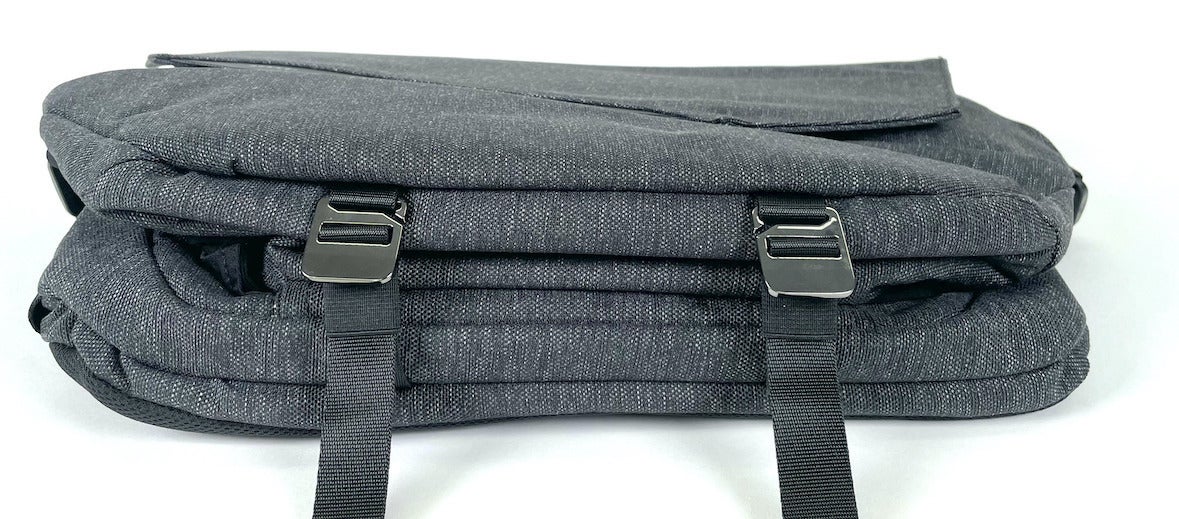 SEKKEI MX-sling はバッグ本体側のプラスチックバックルの向きが左右で違う仕様になっています。片側のボトルポケットの上部にはUSB 差込口があり、バックルがボトルに干渉してしまうのと、バックルが体にあたることを考慮しました。