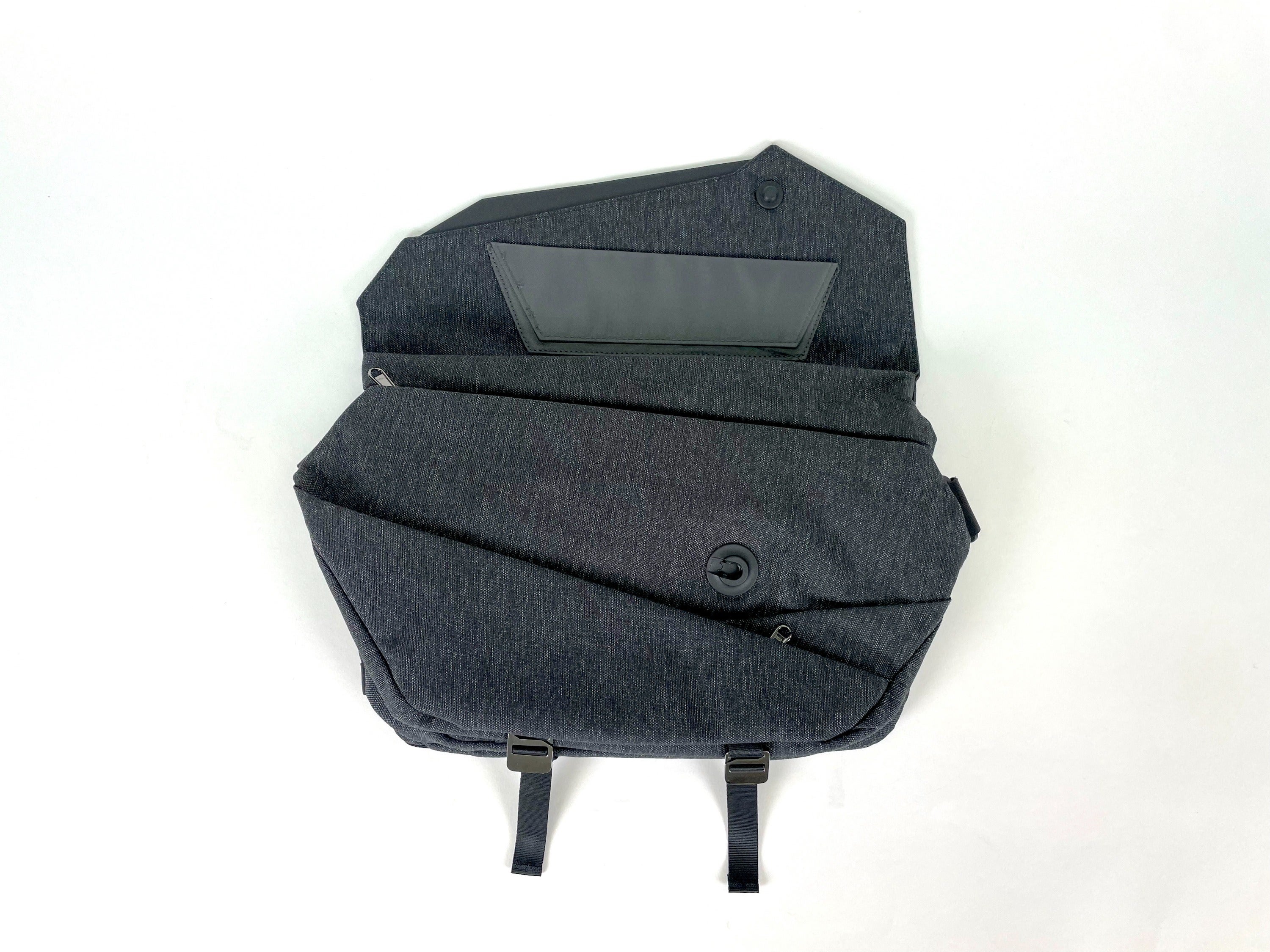 「SEKKEI MX-sling」をアイコニックに見せているのは、この直線的でエッジの効いたフォールドトップ。