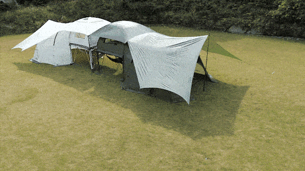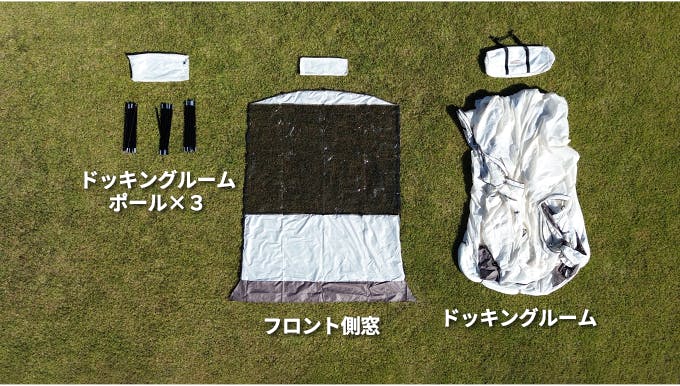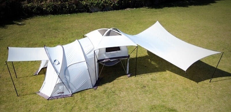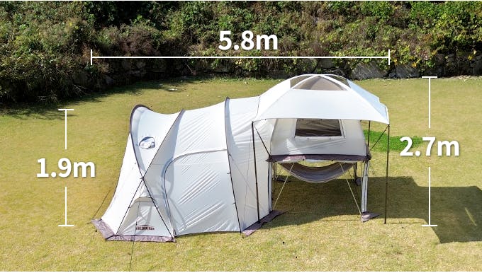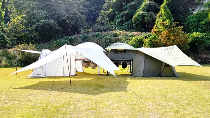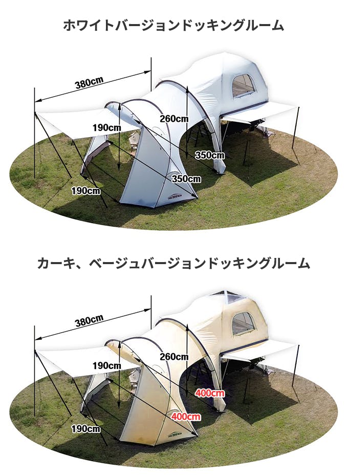 3.大き目サイズのタープとドッキングルームで居住空間を極大活用できる!