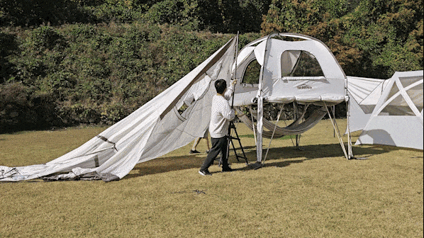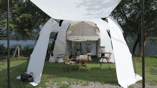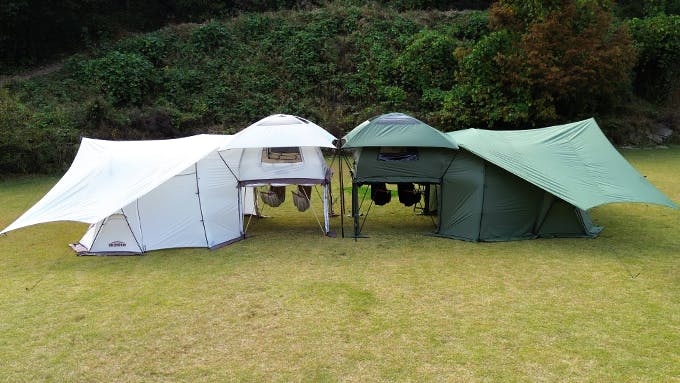 今度ご紹介する「ザ·ドゥカン2」は、自然を楽しめることができるように透明、遮光生地を自由に交換できるように製作し、2階立てテントのパラソルのデザインとドッキングルーム、タープ、窓まで追加され、家族や友人と一緒に四季折々のキャンプを楽しめることができます。