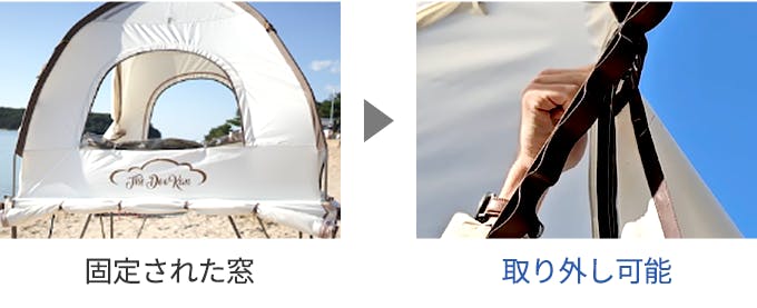 ザ·ドゥカン2にタープとパラソルの取り外しが可能です。 パラソルのベルトを締めて、タープはファスナーを締めるだけで固定できます。