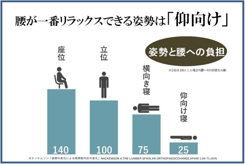 仰向けで寝ている時の腰への負担は、立っている時の4分の1にまで抑えられています。つまり、仰向けに寝ている状態が人間にとって最も楽な姿勢と言えます。