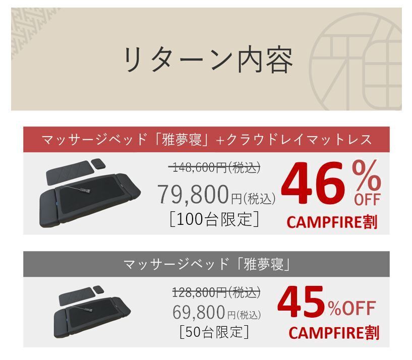 ※リターン価格とは別にCAMPFIRE(machi-ya)のシステム利用料として、支援金額1万円未満の場合は250円(税込)/1万円以上の場合は支援額の2.5%(税込)が支援者様の負担となります。※上記システム利用料はCAMPFIREが受け取るもので、当社が受領するものではございません。
