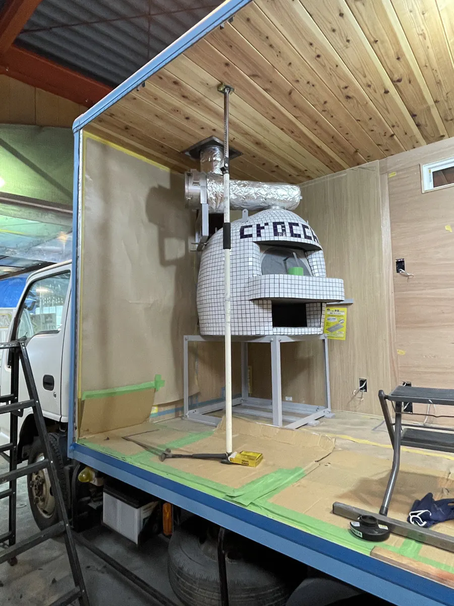 おかげさまで開始からわずか1週間で目標50%を達成しました!現在のキッチンカーの進捗状況です。石窯も搭載され徐々にそれらしくなって参りました!