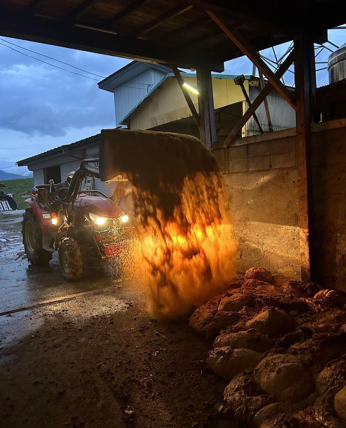 地元の畜産農家の牛ふんをベースに、りんごジュースの搾りかす・もみ殻・地元の酒蔵から分けてもらった酒粕を独自の配合で自家製堆肥を作り、畑で使用しています。
