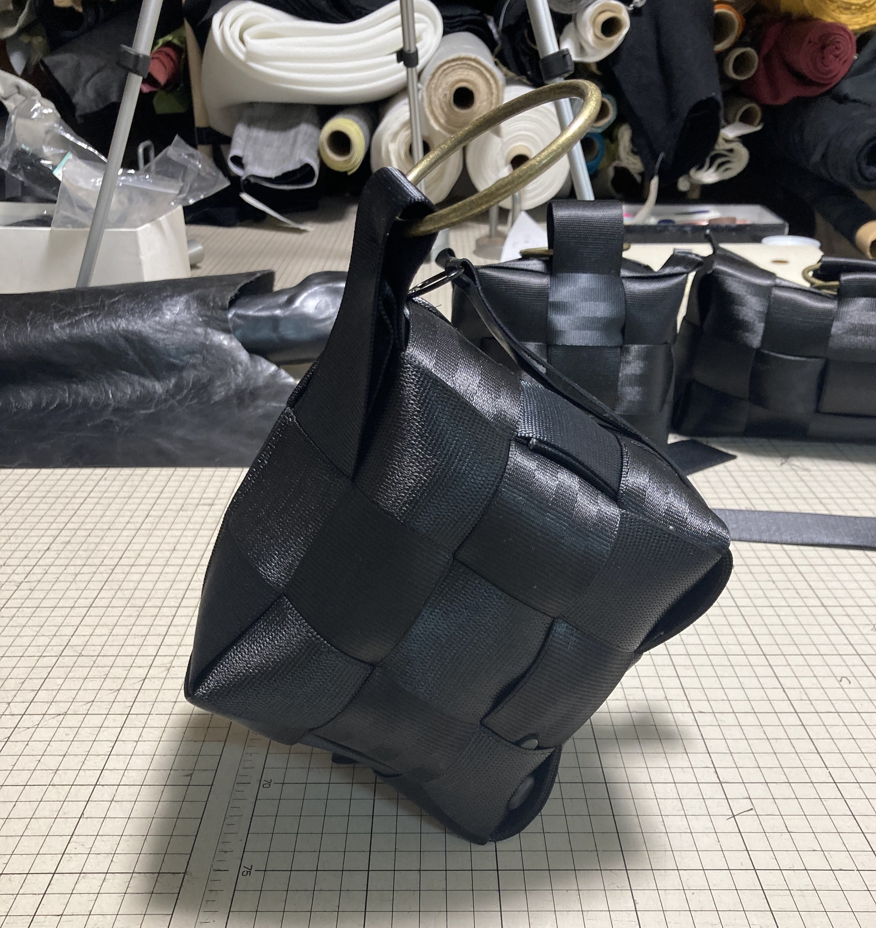 最初は兄のバッグ作りに対して縫製技術者である母と私がアドバイスをしていく、というものだったのが、2021年冬、自分でもシートベルトやエアバッグを材料にしてバッグを作ってみると、次第に独自の素材感やフォルムに魅了されると同時に、創作活動が自己解放だった頃のまるで”遊んでいる”ような感覚を思い出します。