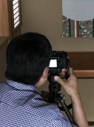 掛軸は床の間に差し込む自然光で鑑賞するのが一番美しいと、自然の光にこだわる平井カメラマン。もちろん表粋会の表具師でもあります。
