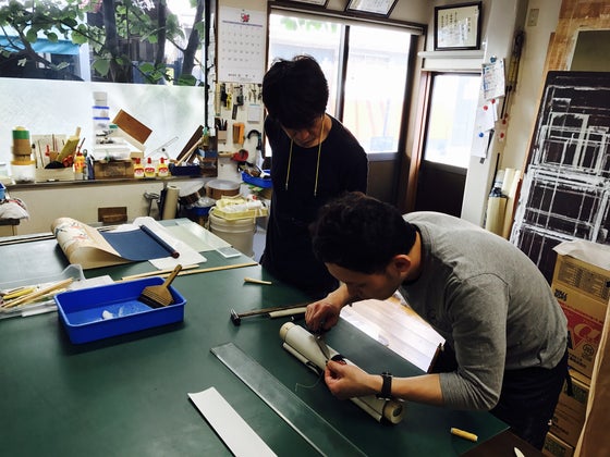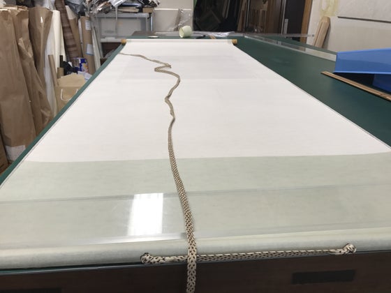 多数のご支援頂きまして誠にありがとうございます。 写真の説明 4/29の表粋会において、当日納品された作品のプレスリリースに使用する写真を撮影している風景です。 掛軸をしまう時はこの様に軸先を持って巻き上げて下さい。