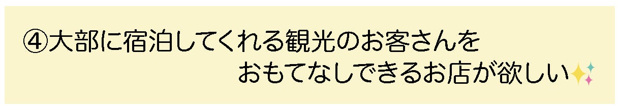 大部地区の宿を選んでくれた大切なお客さんに、焼鳥を食べながら地元の方と交流することで楽しい旅の思い出を作ってもらい、『大部、結構楽しかったね!』と、のちのち思い出話をしてもらえるようなものを一つでも増やしたいのです。