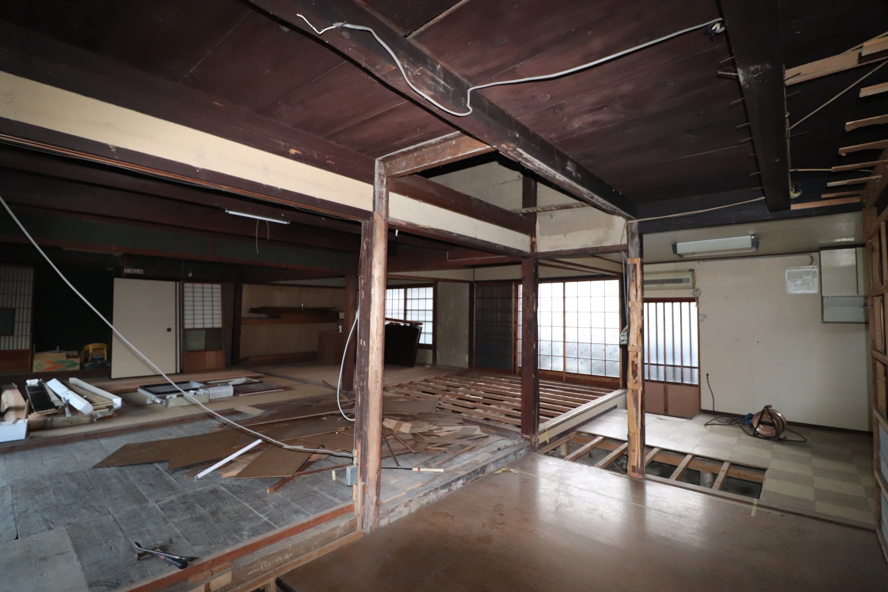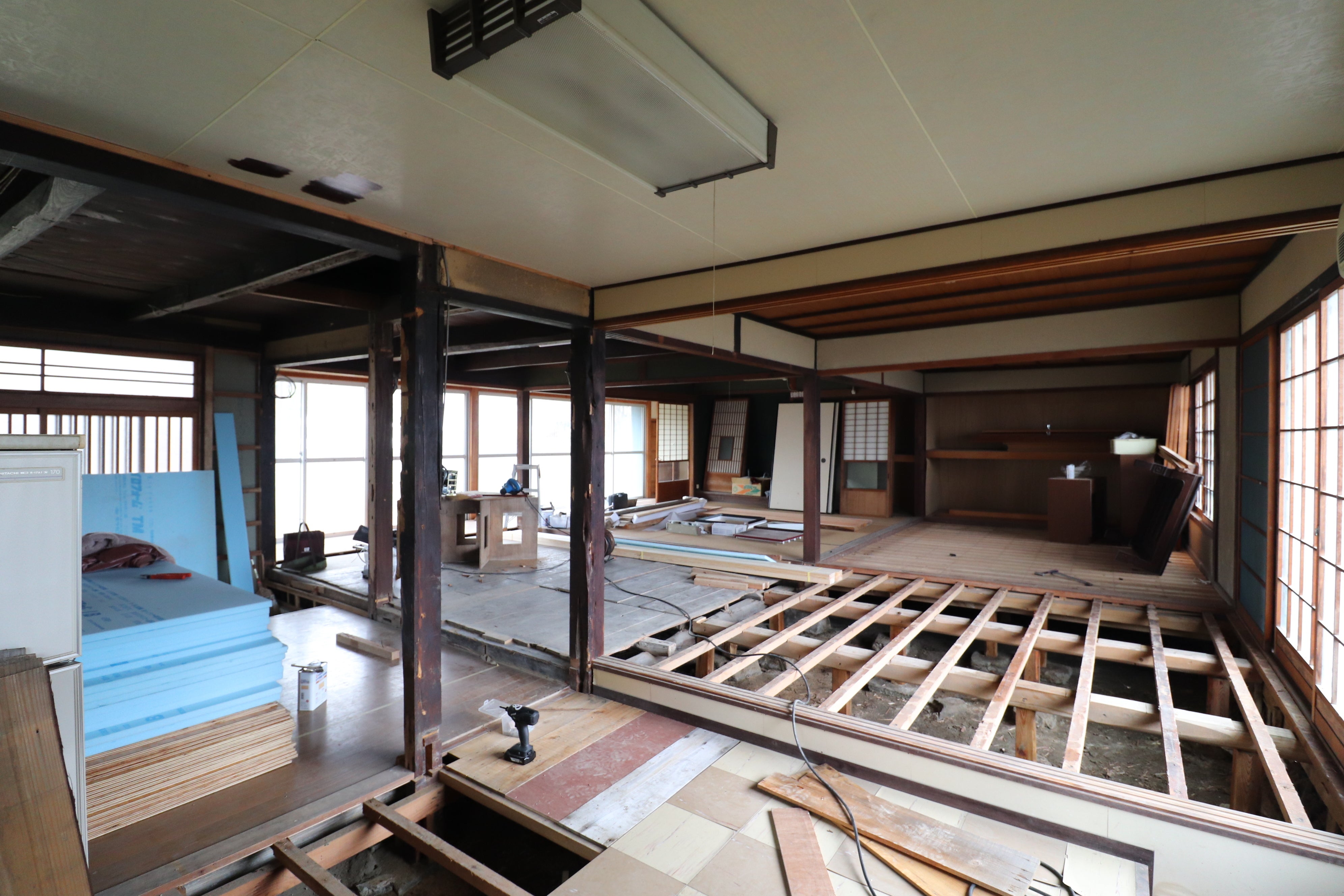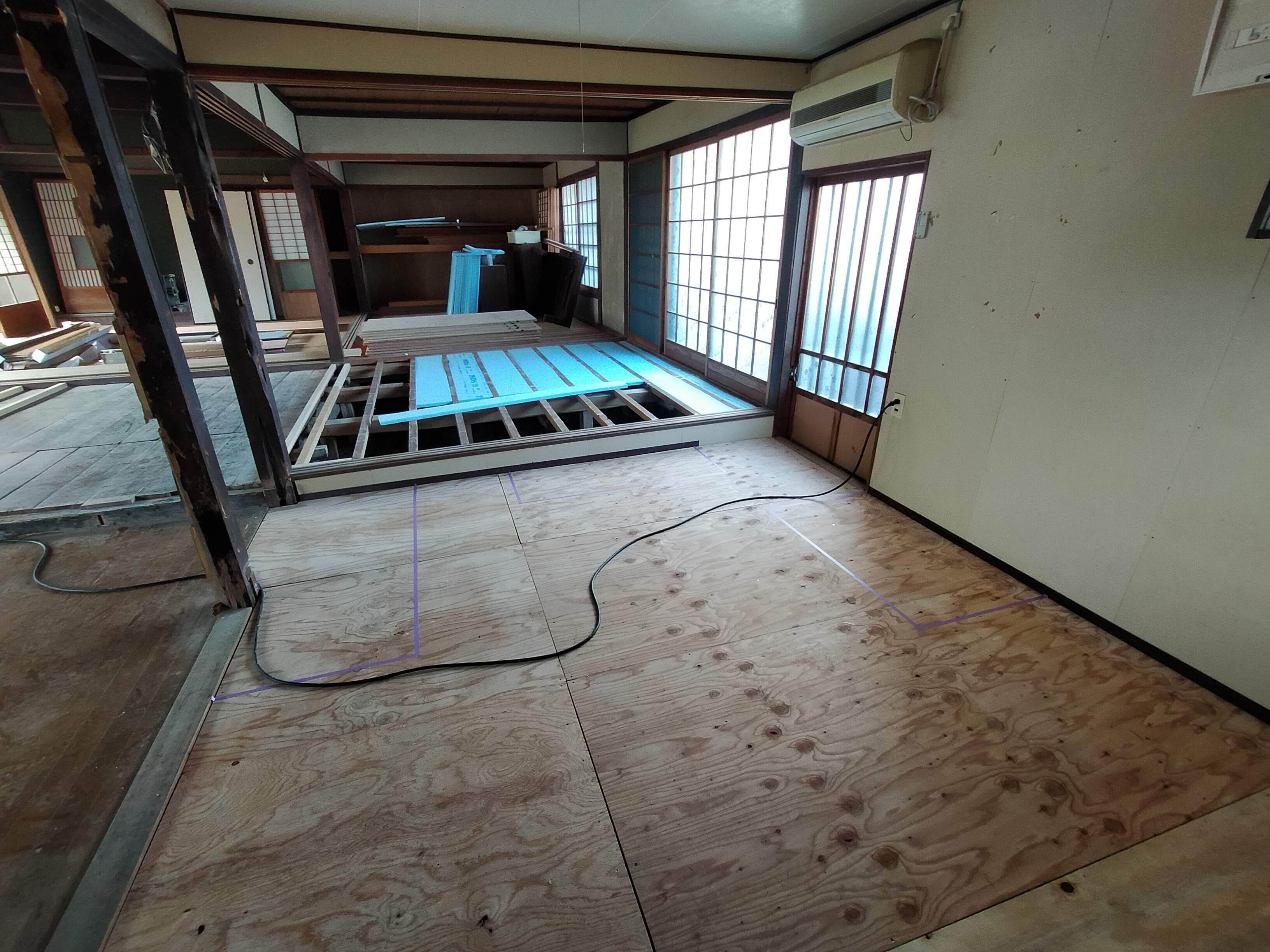 2024/04/03 00:03皆様、こんにちは!ご支援いただいた方々、本当にありがとうございます!今回は、客席になるエリアです♪古民家なので床から熱が逃げるためしっかりと断熱材を施工し、合板下張りが完了いたしました!この上にシックで暗めなフローリングで仕上げる予定です。古民家の趣ある空気感と、シックなフローシングで落ち着いた空間で焼鳥とお酒を存分に楽しんでいただければと思います♪写真の右奥がキッチンですが、そこを囲むようにL型カウンターが造作されます。徐々に完成に近づいていく様子も楽しんでください♪今後とも応援のほど、何卒よろしくお願い致します! もっと見る