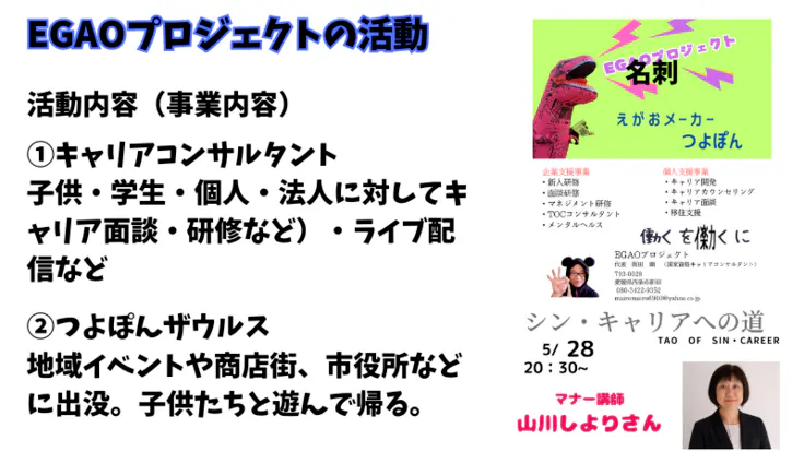 キャリアコンサルタントとして、個人及び法人に対するキャリア支援・中高生へのキャリア教育の講師業など(EGAOプロジェクトという屋号の個人事業主)