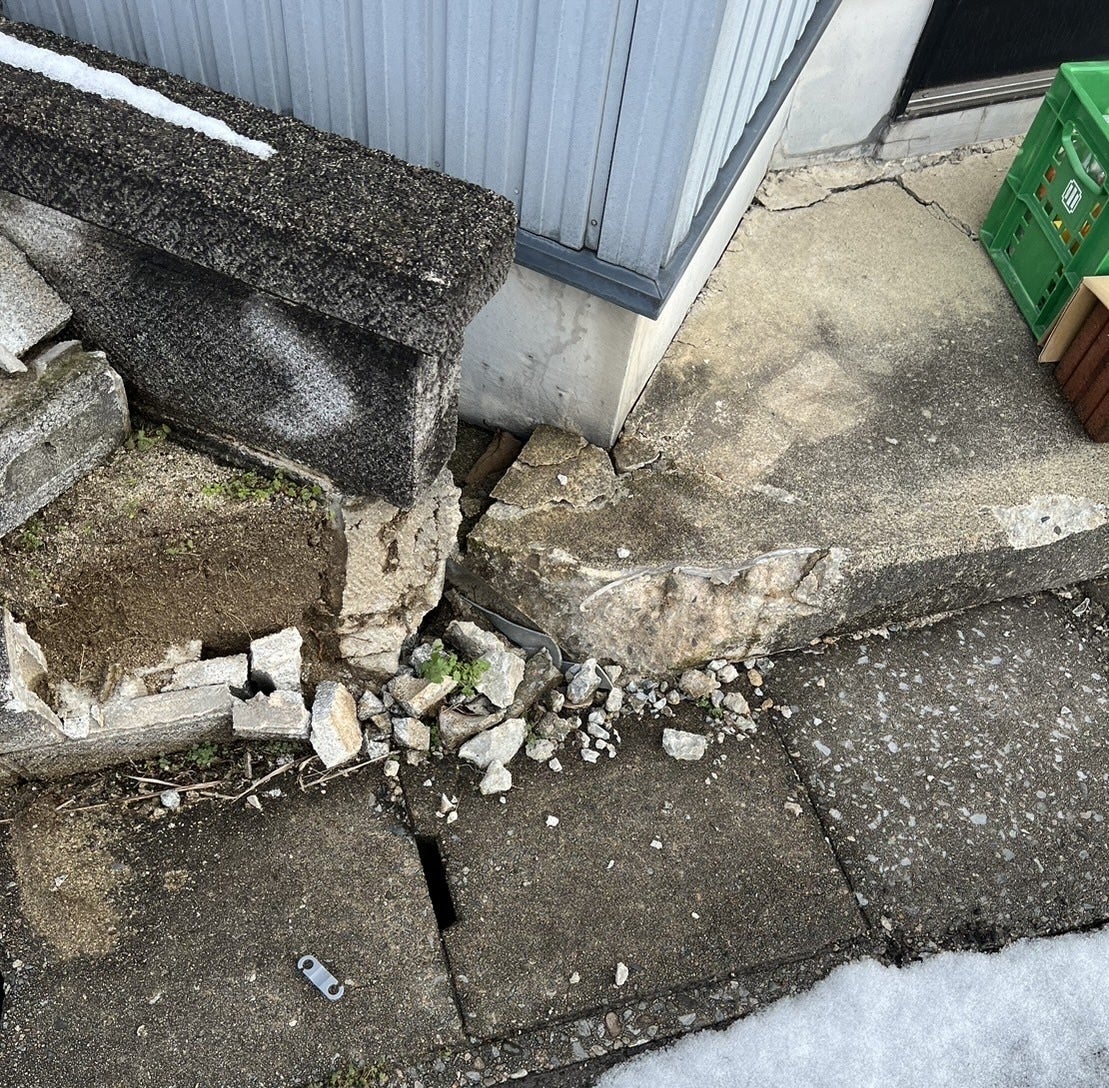 能登半島地震の影響で、パン工場が地盤沈下し、最大22㎝傾いています。入口のドアも開かない状態です。