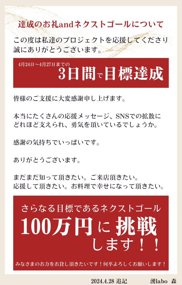 2024/06/04 17:37無事オープンいたしました!!皆様、オープンとクラファンの終了が重なりご挨拶が遅れましたことお詫び申しあげます。やっと皆様のご支援と応援のご尽力により無事6月1日にオープンすることができました。本当に本当に長く険しい道でした。一番は何かなと思い出していくと一番が多すぎて。。詐欺にあったこと、融資が降りなかったこと。今思えば一つづつがどん底でその度にみなさんのご支援額が上がるたび一つの光だった事は間違いありません。今こうやってオープンできた事は本当に自分たちだけではできなかったと思います。本当にありがとうございます。オープンし少し流れも落ち着いたのでリターンの準備に入りました。のれんは今見積もり中。そしてメッセージを少しづつ始めさせていただきます。そして動画ですがユーチューブとお伝えしていましたがアドレスに直接送らせていただくかもしれません。またリターンはご報告させて頂きます。コースはいつでもお越しいただけると嬉しいです!!オープンやから忙しいやろ〜なんて考えられずに是非是非お待ちしております。皆様、オープンしましたがこれからも邁進してまいりますのでぜひ成長を見守っていてください。湧LABO 森有美 もっと見るお料理のご紹介パート3