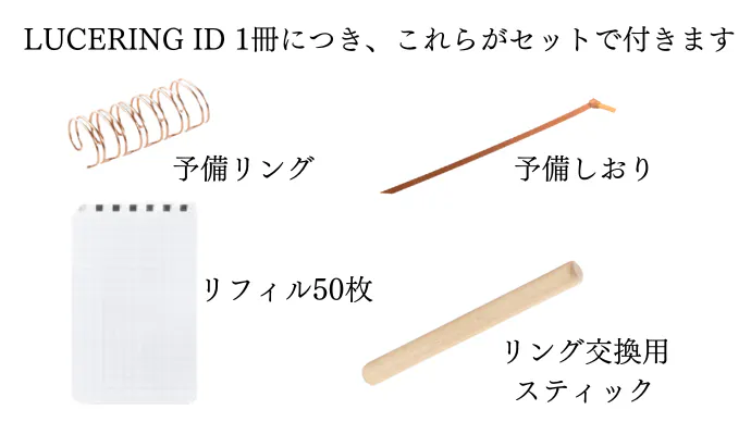 LUCE RING:IDケース1冊(用紙とリングはセットされています)交換用紙50枚、リング取り外し工具(木の棒)、替え用リング1個、ネックストラップ(セットの場合)